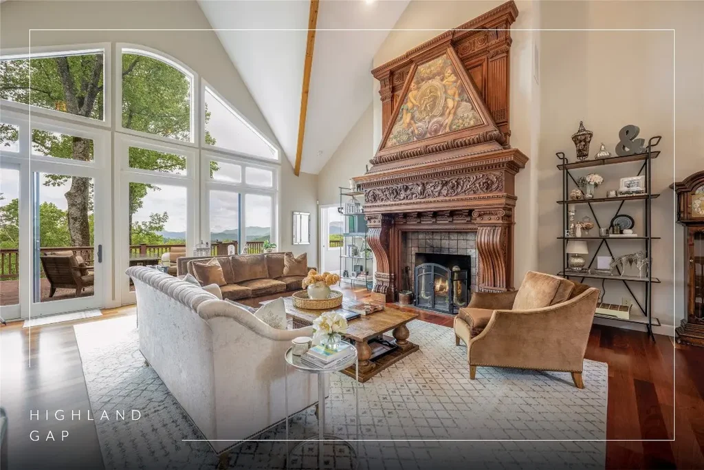 Accepting Back-Up Offers. Discover luxury & privacy in this one-of-a-kind estate perched on 7.63 acres within the exclusive Highland Gap community. This meticulously crafted home offers a true retreat, showcasing panoramic long-range views, blending exquisite design elements and worldly treasures. Antique German doors open into the great room featuring soaring vaulted ceilings with wood beams, a hand-carved Roman wood-burning fireplace and expansive windows framing breathtaking mountain vistas. Brazilian cherrywood floors lead to the gourmet chef’s kitchen - thoughtfully designed with dual islands & professional-grade appliances including a Sub-Zero refrigerator, two dishwashers, side-by-side ovens, & a five-burner range with a griddle. One of the two dining spaces boasts a custom backlit Tiffany-style stained-glass ceiling, while the other dining area features a striking custom apothecary cabinet and the mountain view. The main level offers stunning views from every corner, including the primary suite, which features a generously sized ensuite bathroom, an expansive closet and direct access to the wraparound deck. Two additional bedrooms share a thoughtfully appointed bathroom, while a powder room and a large laundry room complete the level. Outdoor living shines with an expansive deck and a covered, screened-in porch with a cozy gas fireplace. The lower terrace level, perfect for entertaining or relaxation, features a locally handcrafted fireplace with a nature-inspired design, a 1,000-bottle wine cellar framed by intricate Indonesian temple doors, and a spacious living area with a gas fireplace. A wet bar with a wine fridge and ice maker adds ultimate convenience, while two additional bedrooms share a well-furnished bathroom. The outdoor space includes a fire pit area and stunning views. The detached garage apartment enhances the property with one bedroom, one bonus room, two bathrooms, a full kitchen and a private porch offering mountain vistas. Large windows welcome natural light throughout, & amenities include a gas fireplace, a private laundry room and modern finishes. Additional highlights of this estate include refinished wood floors, new carpet, fresh paint & updated siding on the guest house (all updates from 2022). A two-car carport with an EV charger, a 2.5-car garage & a partial generator provide practical conveniences. The Highland Gap community further enriches the experience with scenic waterfalls, walking trails & shared community events.