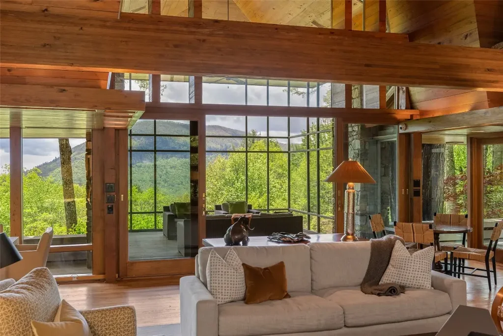 This striking estate is a true work of art by the late Jim Fox, the pioneering architect who brought modernist design to the Highlands-Cashiers Plateau. As the area’s first design/build firm of its kind, Fox created homes that are both timeless and one-of-a-kind—and this residence is no exception. Updated and restoration completed in 2024, with careful attention to detail, the home is privately situated on a beautifully wooded site and blends natural elements with contemporary elegance. Rich stonework, warm woods, expansive glass, and thoughtful geometry define the architectural language of the property. A close framed-up view of Whiteside Mountain adds a dramatic natural focal point to the landscape. The main house features two spacious bedrooms and two and a half baths, all wrapped in an open, light-filled floorplan that invites nature in through walls of windows framing sweeping mountain vistas. Crafted with an artist’s eye, the interior showcases signature Fox details—soaring ceilings with exposed beams, dramatic stone columns, custom millwork, and hardwoods that exude warmth while anchoring the modern aesthetic. Just off the foyer and living room, an indoor water feature with planting wells adds to the sensory experience, bringing the peaceful sounds and textures of nature indoors. Ideal for hosting family and friends while offering privacy and independence, the two-bedroom, two-bath guest house with a fireplace and a private screened porch complements the main residence with matching architectural character and comfort. The guest house also features a game/workout room on the lower level. Outdoor highlights include a lovely dahlia garden that will come into bloom over the summer, a large stone cairn, tranquil water features, a Zen-inspired courtyard, and a beautifully landscaped backyard that's perfect for both pets and their people—all contributing to the seamless integration of indoor and outdoor living. This home is more than a dwelling—it’s a sensory experience, a peaceful sanctuary, and a testament to visionary design. Whether you are a lover of architecture, a connoisseur of modern design, or someone seeking an exceptional retreat located between Highlands and Cashiers, this Jim Fox original is a rare opportunity to own a true legacy of mountain modernism.