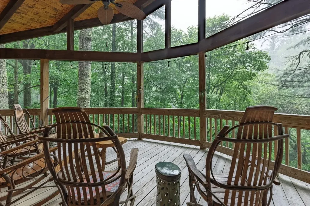 Located just 10 minutes from downtown Highlands, this home sits in a quiet subdivision along a gravel road, offering both privacy and easy access. Two expansive decks—one on each level—create inviting spaces for outdoor relaxation. The main level includes two bedrooms, and a distinctive red-painted kitchen that adds character and warmth. The lower level is finished for guests or additional living space, providing flexibility for your needs. Positioned between Highlands and Cashiers, the property is convenient to Skyline Lodge, Oak Steakhouse, and the dining and shopping of Main Street. National Forest trails and scenic hiking are just minutes away. Wood siding with a red metal roof. Lot features a small stream.