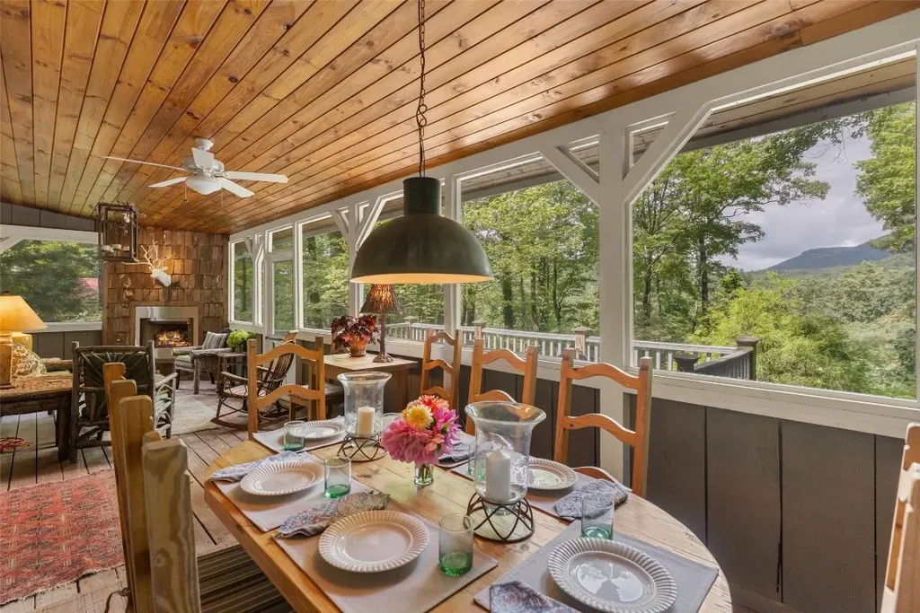 This fully furnished cabin has everything you need for a Highlands get-away! The star feature is the screened porch with a fireplace, sitting area, dining area and view. Easy access to the deck for grilling and the back yard with a fire pit and area for gardening. The great room includes the living area with a woodburning fireplace, dining nook and updated kitchen with breakfast bar. There are 2 bedrooms and a bath on the main floor. The lower level has a third bedroom with en-suite bath, bunk area, sitting room with access to the outside and the laundry room. The property comes with an extra lot behind the cabin to ensure view protection as well. It also includes a single carport, storage shed, and firewood storage shed. The dual circular driveway provides room for plenty of parking and easy egress. All of this is just 3 miles from town and outdoor activities.