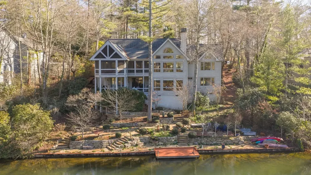 Situated directly on Lake Soquilla in Burlingame, this three-bedroom, three-bathroom home offers the ultimate mountain retreat. The living room showcases soaring cathedral ceilings, exposed beams, and a striking stone fireplace, all framed by tall windows that capture sweeping views of the lake and surrounding mountains. The main level features a spacious screened porch, perfect for dining or relaxing while overlooking the water. The lower level includes a large family gathering area, a built-in office, and a second kitchen designed to serve guests and outdoor entertaining spaces. Tankless water heater. Outdoors, professionally designed landscaping by Mary Palmer Dargan creates a true waterfront oasis. Stone paths lead to a fire pit and your own private dock, where you can launch a canoe or simply enjoy the serenity of being right on the lake. Located on a quiet cul-de-sac street with convenient access to the Burlingame Country Club, this property combines privacy, natural beauty, and comfortable living in one exceptional lakefront home. Other amenities available upon membership.